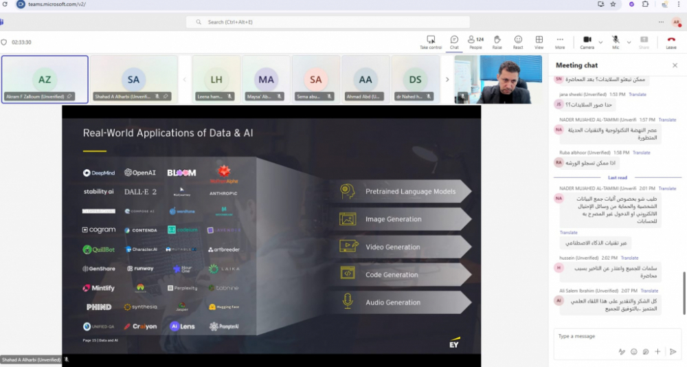 قدّم الورشة خبراء مختصون من شركة EY السعودية، بمشاركة مميزة من محاضري وطلبة الجامعة وخريجيها ورواد الأعمال المهتمين بالتقنيات الحديثة والتحول الرقمي، حيث أتاحت لهم الورشة فرصة لفهم الاتجاهات المستقبلية في الذكاء الاصطناعي ودوره في تطوير بيئة الأعمال وتحسين اتخاذ القرار وتطبيقات الذكاء الاصطناعي والبيانات في عالم الأعمال.