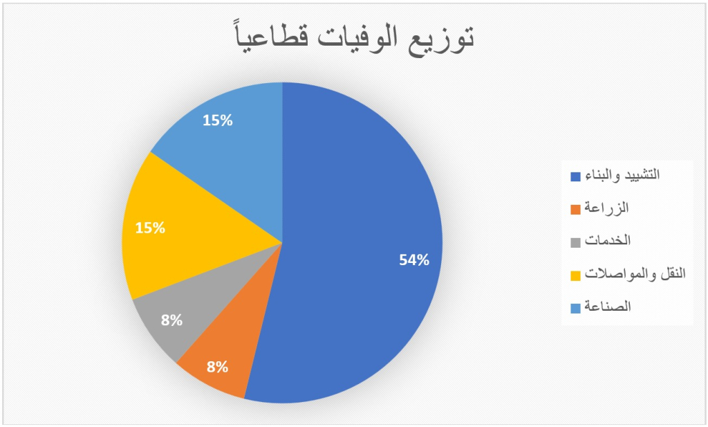 يُظهر هذا التوزيع سيطرة قطاع التشييد والبناء كأكثر القطاعات خطورة في سوق العمل الفلسطيني، حيث سجلت فيه 7 وفيات، وكان أكثر تكرار الوفيات بسبب السقوط من علو بواقع 5 وفيات بواقع 40%، وتكررت 3 وفيات بسبب سقوط اجسام على رؤوس المتوفين بنسبة 25%، وأخيرا وفاتان بسبب انقلاب شاحنات بنسبة 15%.