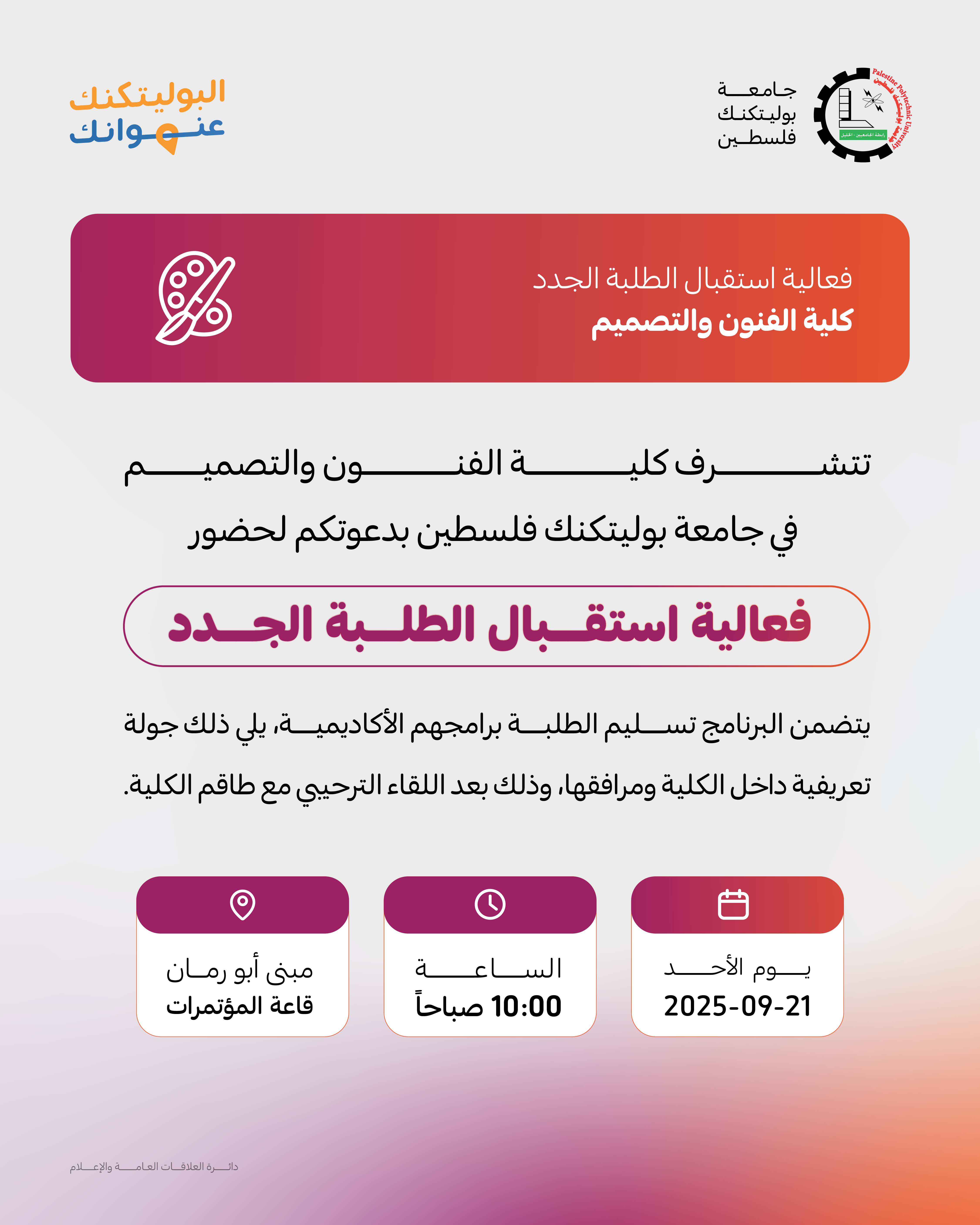 تتشرف كلية الفنون والتصميم في جامعة بوليتكنك فلسطين بدعوتكم لحضور فعالية استقبال الطلبة الجدد الملتحقين بالكلية.