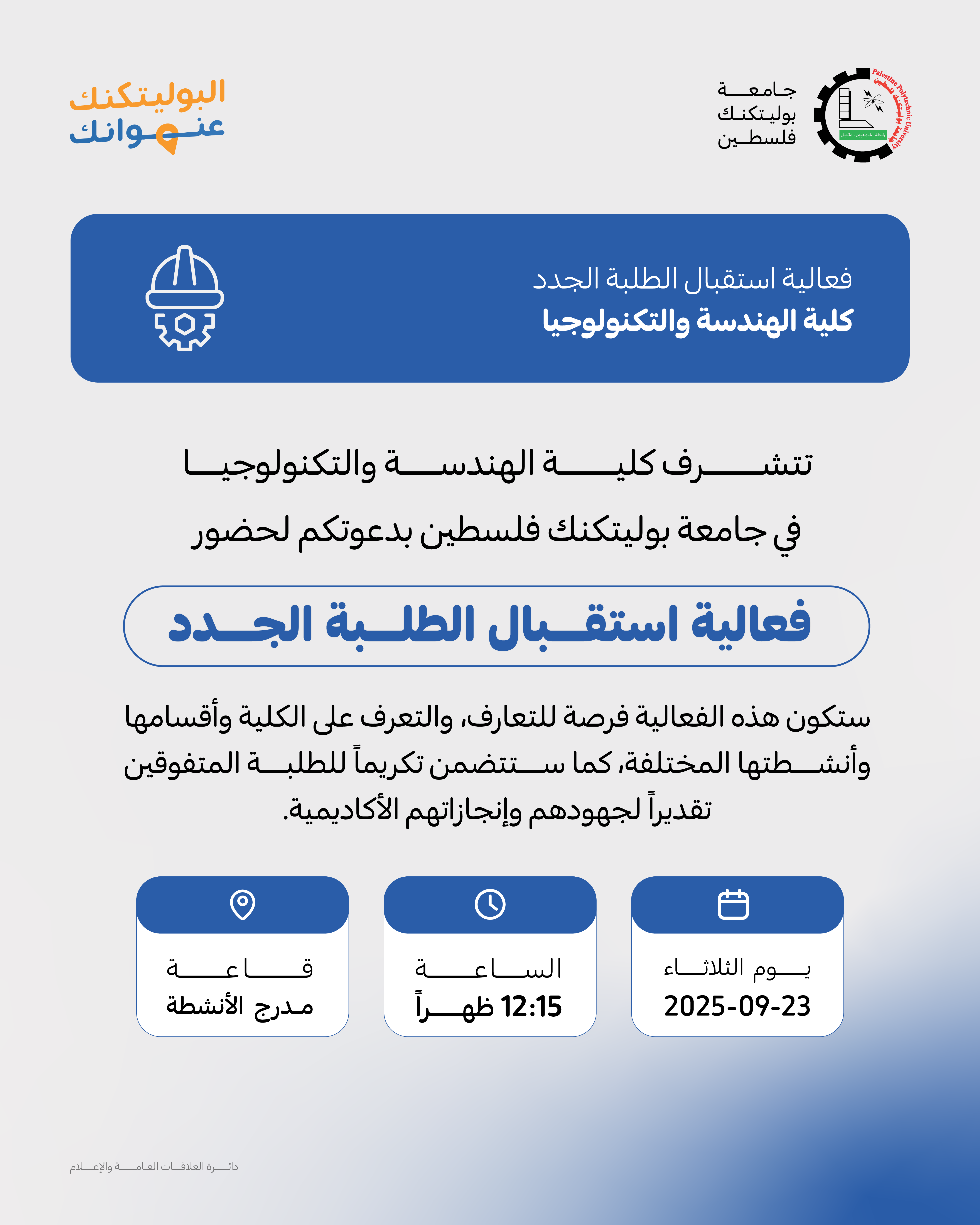 تتشرف كلية الهندسة والتكنولوجيا في جامعة بوليتكنك فلسطين بدعوتكم لحضور فعالية استقبال الطلبة الجدد الملتحقين بالكلية، وتكريم الطلبة المتفوقين.