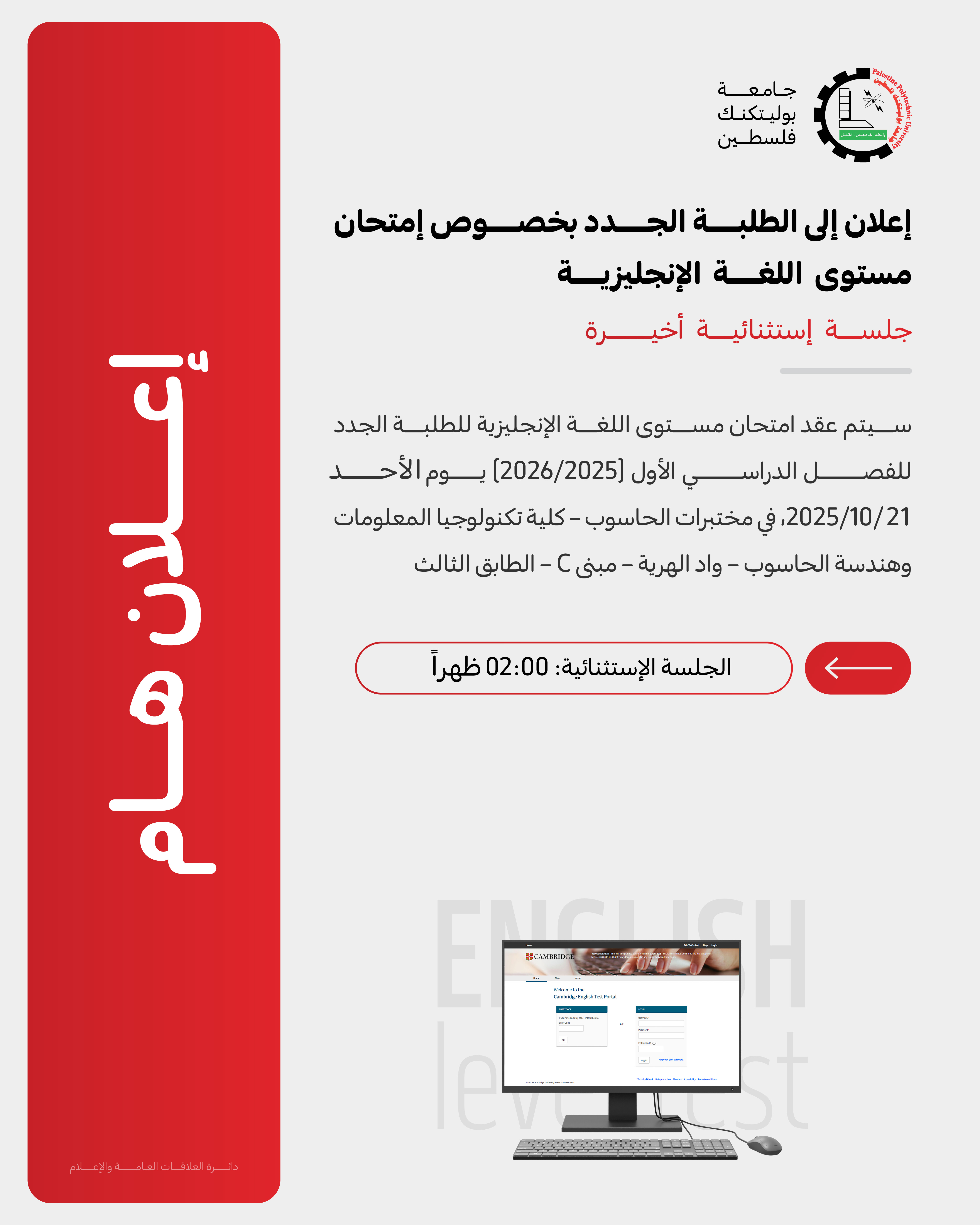 تم تأجيل عقد امتحان مستوى اللغة الانجليزية (الجلسة الأخيرة) للطلبة الجدد الذي كان مقرراً يوم أمس الأربعاء إلى يوم الأحد الموافق 12/10/2025 وذلك بسبب أعمال الصيانة لموقع تقديم الامتحان (Cambridge Metritest). وعليه يرجى من الطلاب المتقدمين للامتحان التواجد في مختبر الخوارزمي يوم الأحد الساعة الثانية بعد الظهر.