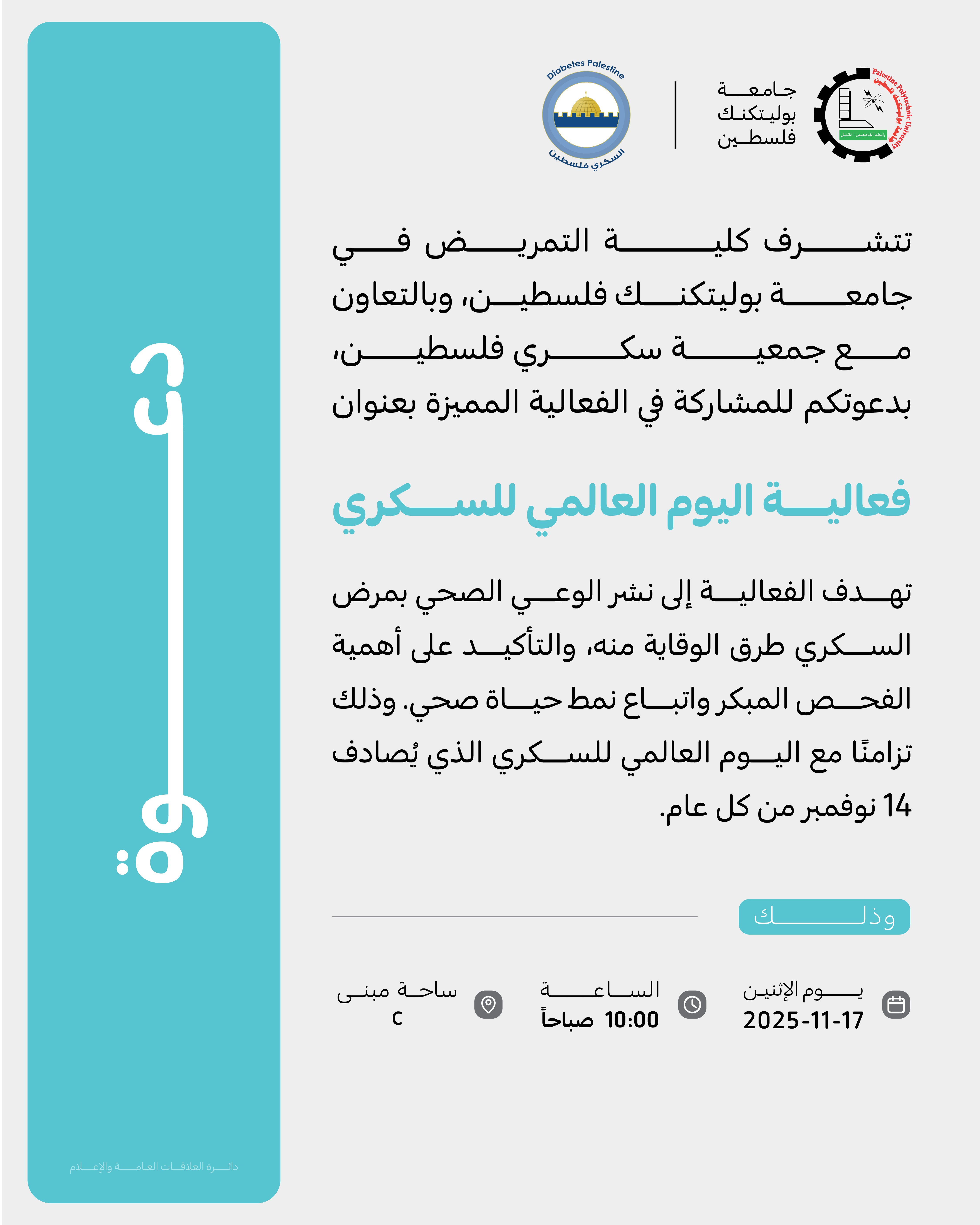 تتشرف كلية التمريض في جامعة بوليتكنك فلسطين، وبالتعاون مع جمعية سكري فلسطين، بدعوتكم للمشاركة في الفعالية المميزة بعنوان