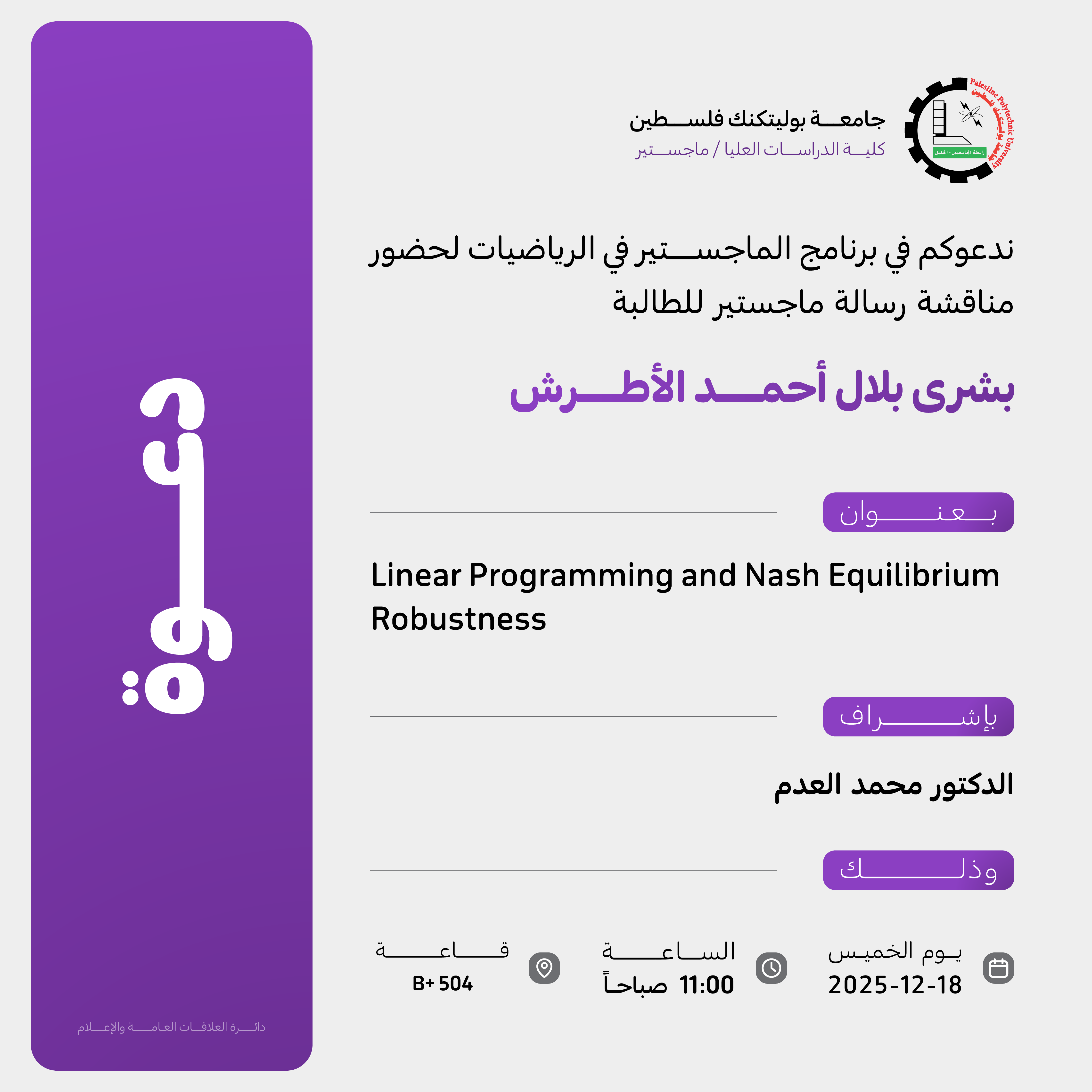 يدعوكم برنامج الماجستير في الرياضيات بالتعاون مع عمادة الدراسات العليا والبحث العلمي لحضور مناقشة رسالة الماجستير للطالبة