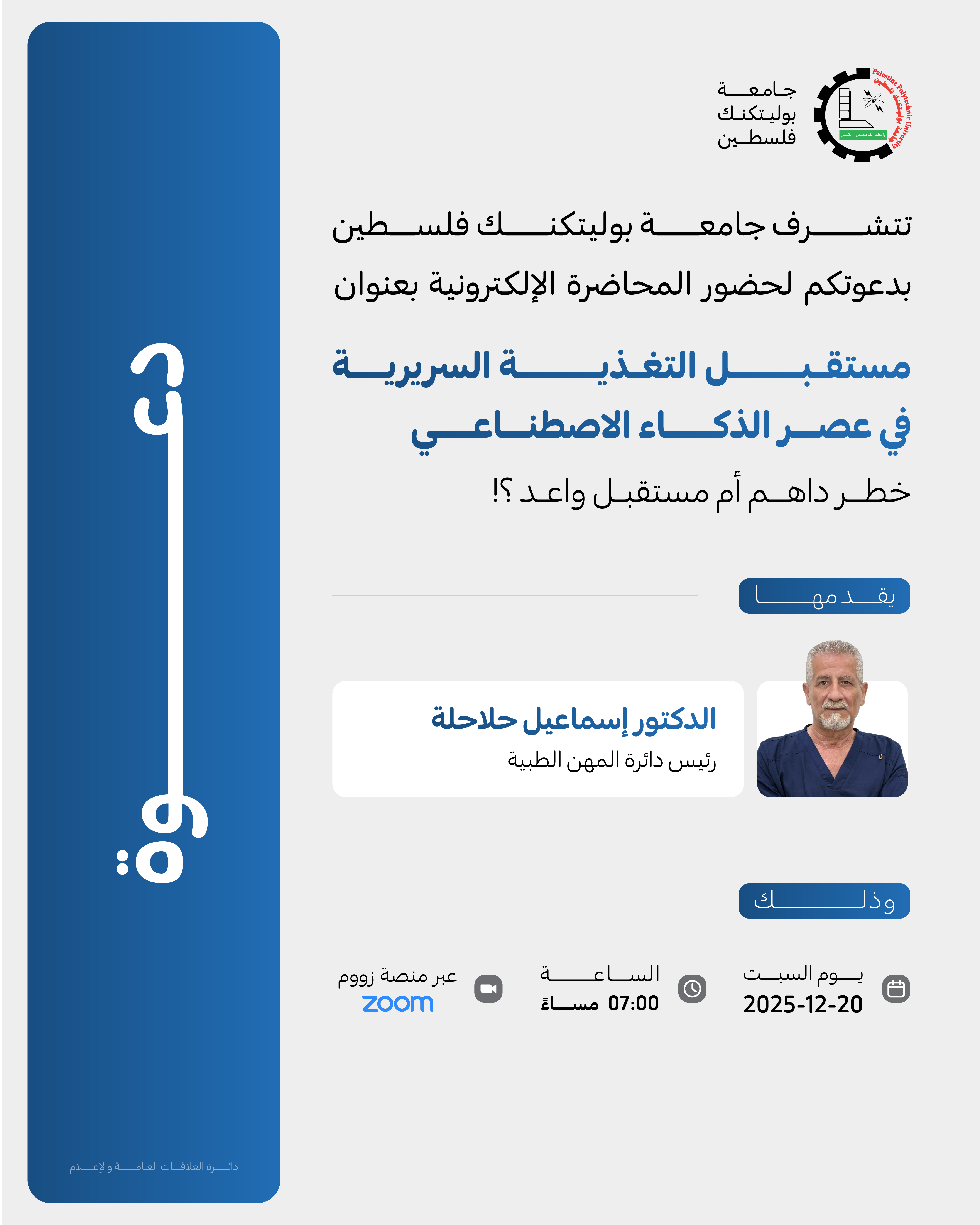 Palestine Polytechnic University (PPU) - دعوة لحضور المحاضرة الإلكترونية بعنوان: مستقبل التغذية السريرية في عصر الذكاء الاصطناعي