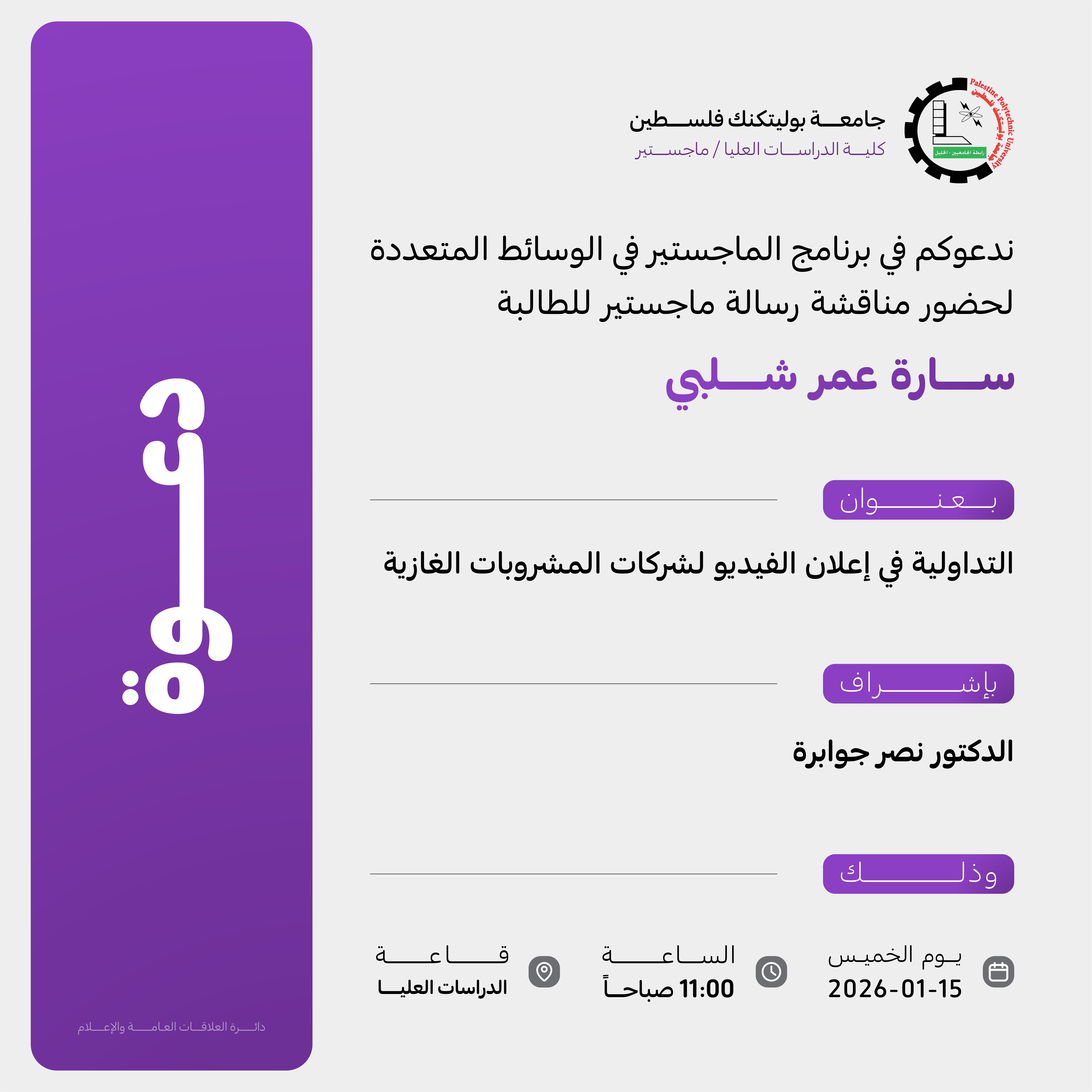 يتشرف برنامج الماجستير في الوسائط المتعددة بدعوتكم لحضور مناقشة رسالة الماجستير للطالبة: