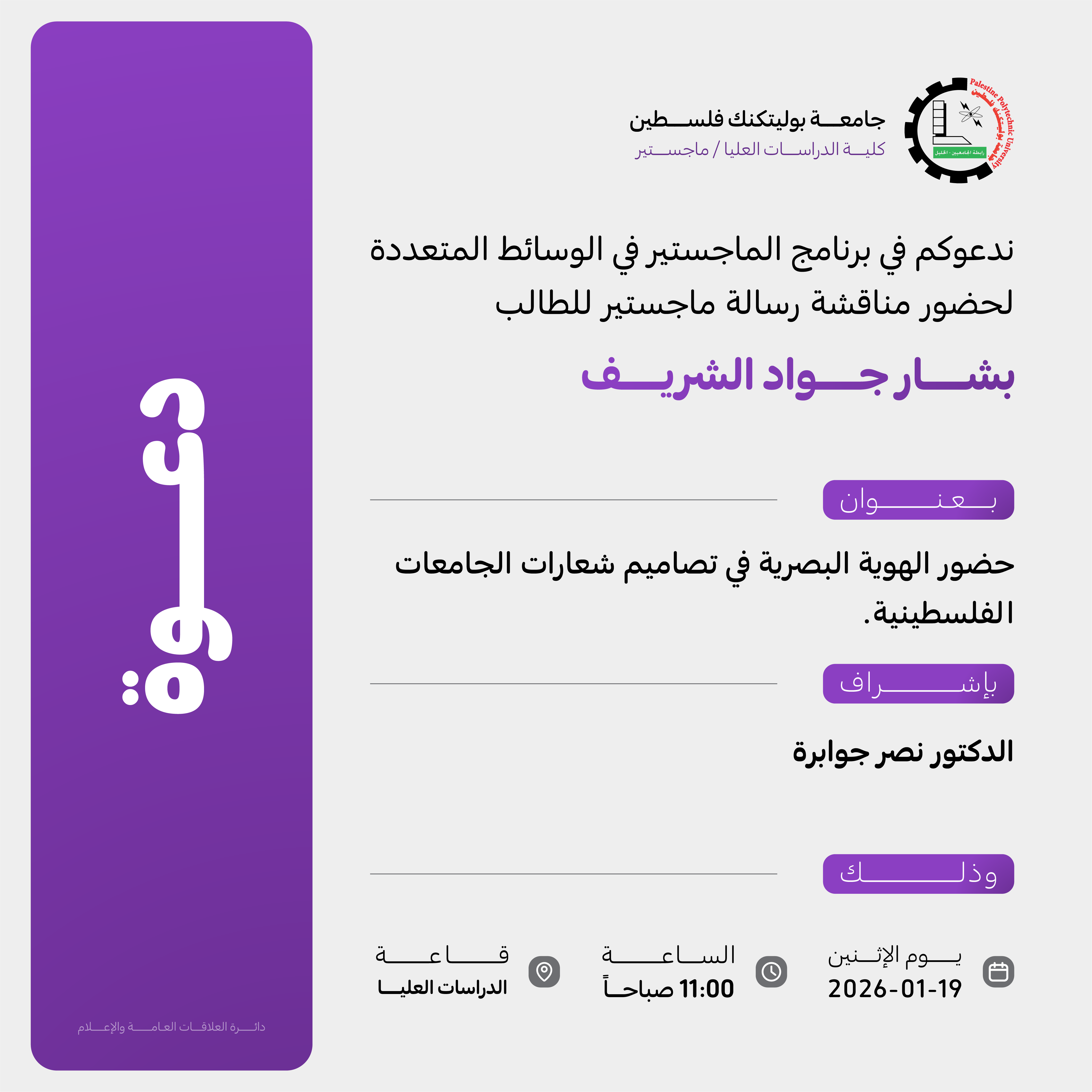 ندعوكم في برنامج الماجستير في الوسائط المتعددة لحضور مناقشة رسالة الماجستير للطالب بشار جواد الشريف