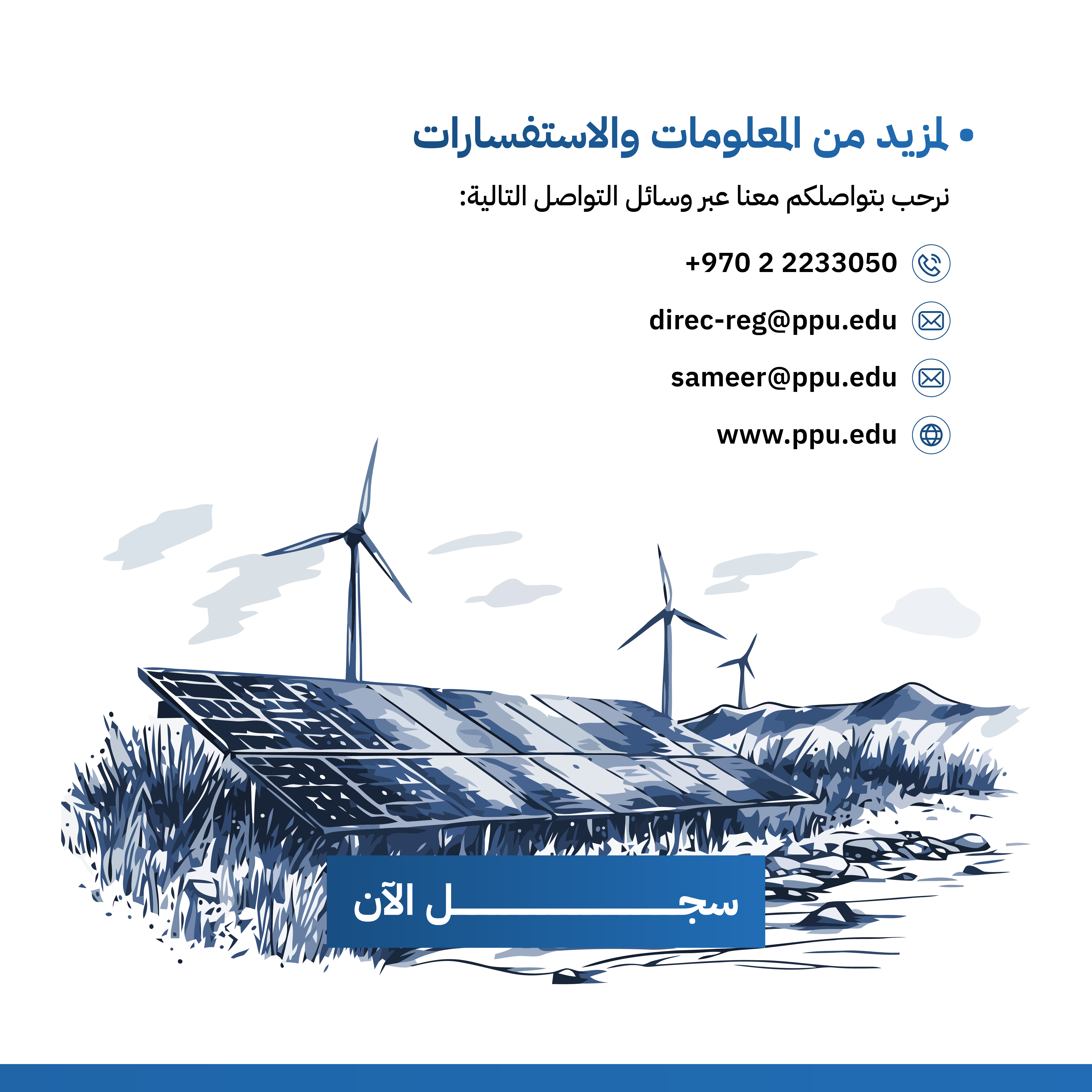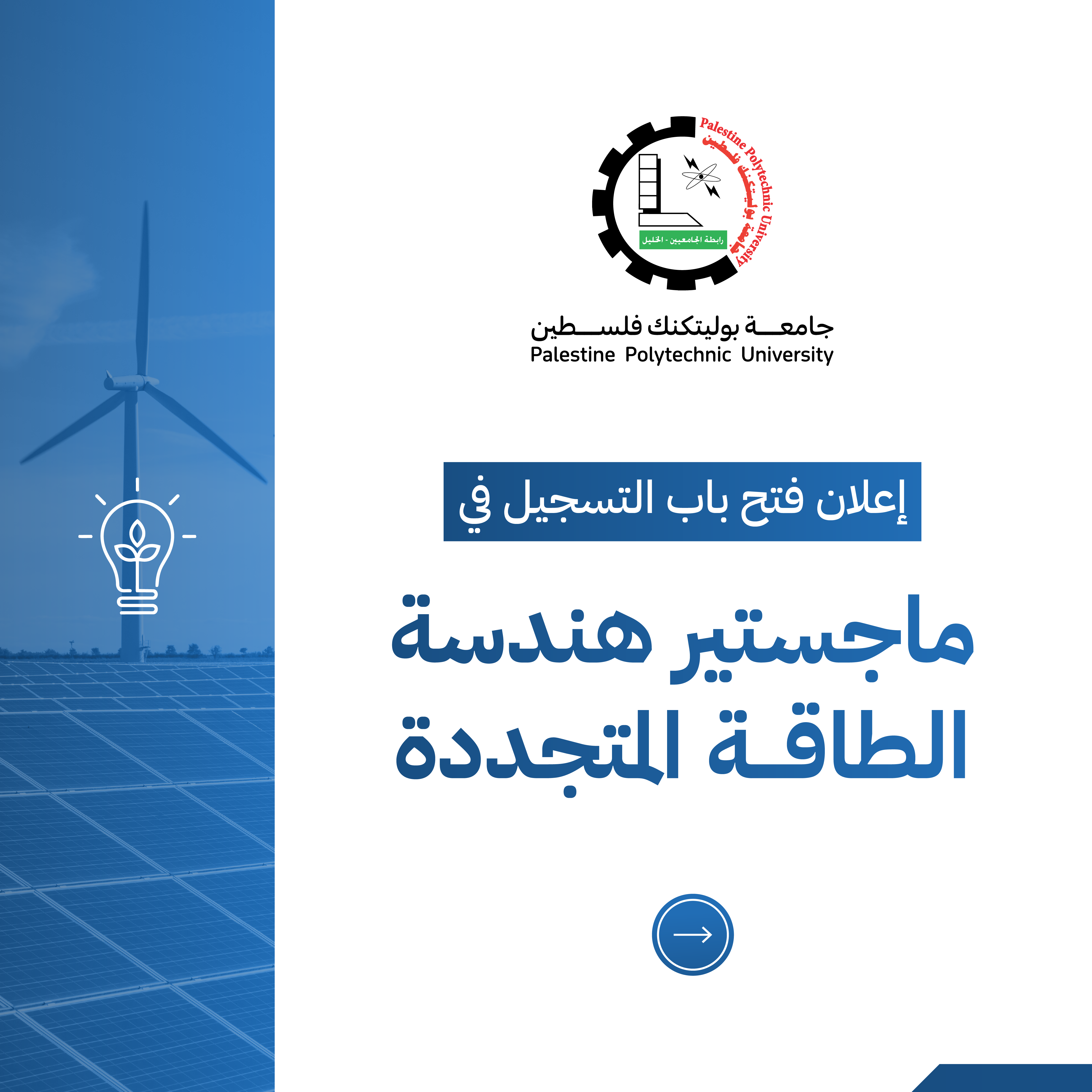 تعلن جامعة بوليتكنك فلسطين عن فتح باب تقديم طلبات الالتحاق للفصل الدراسي الثاني من العام الأكاديمي 2520/ 2026 في برنامج ماجستير الطاقة المتجددة والاستدامة، علماً بأن البرنامج سيعمل على توفير فرص للطلبة لحضور محاضرات مع جامعات اوروبية ولبنانية ضمن برنامج إيراسموس.