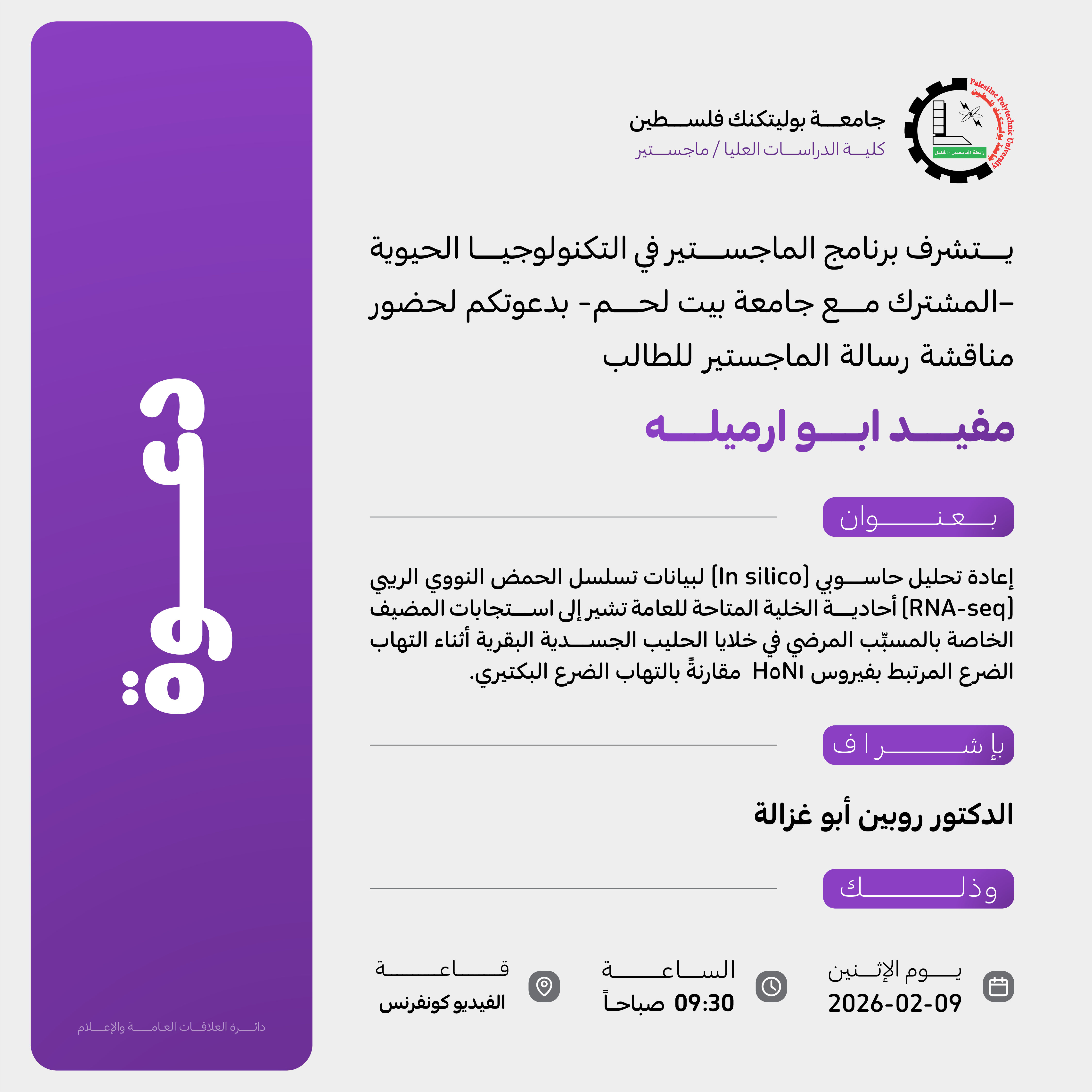 يتشرف برنامج الماجستير في التكنولوجيا الحيوية –المشترك مع جامعة بيت لحم- بدعوتكم لحضور مناقشة رسالة الماجستير