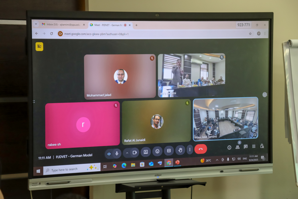 عقب ذلك، قدّم وفد جامعة لشبونة عرضاً تعريفياً بالجامعة وتجاربها، إلى جانب تقديم فكرة عامة عن المشروع. كما قامت مديرة المشروع المهندسة صفاء سدر بعرض النموذج الألماني للتعليم المهني والتقني المزدوج وطرق مواءمته لتصميم النموذج الفلسطيني الأردني بما يعزز مكانة التعليم والتدريب المهني والتقني ولا يتعارض مع السياق المحلي لكلا الدولتين، كما استعرض فريق المشروع المهندس معتصم النتشة والمهندس علاء التميمي نشأة المبادرة وأهدافها ومخرجاتها المتوقعة وأهميتها على المستويين الفلسطيني والأردني.