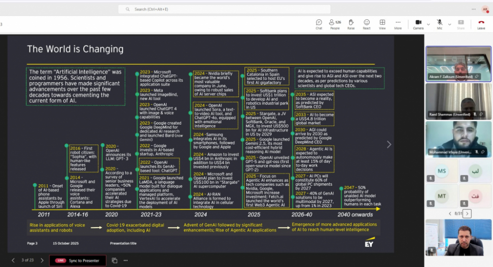 الخميس 16/10/2025- نظّمت حاضنة أعمال جامعة بوليتكنك فلسطين، بالتعاون مع شركة EY MENA العالمية، ورشة تدريبية متقدمة بعنوان "Data & AI – البيانات والذكاء الاصطناعي عبر منصة Microsoft Teams، ضمن سلسلة الورش التدريبية المشتركة بين الجانبين.