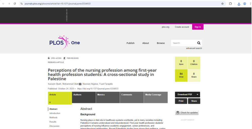 الاحد 26/10/2025- في إنجاز أكاديمي جديد، نشر فريق بحثي من كلية التمريض في جامعة بوليتكنك فلسطين دراسة علمية في مجلة PLOS ONE العالمية، المصنّفة ضمن الربع الأول (Q1) في قواعد بيانات Scopus  وWeb of Science، والتي تمتلك معامل تأثير (Impact Factor)  يبلغ 3.2 لعام 2025.