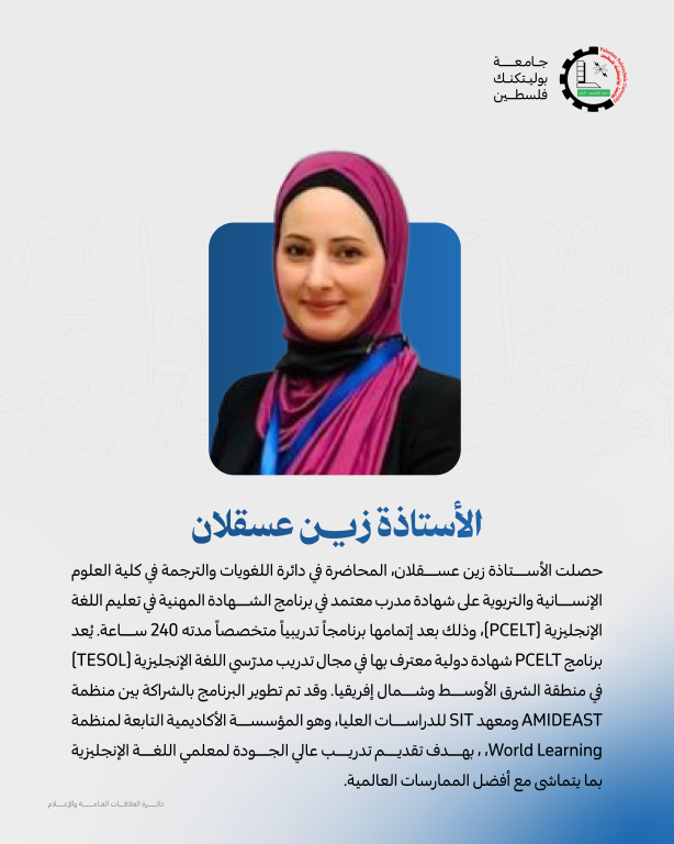 الثلاثاء 04/11/2025- حصلت الأستاذة زين عسقلان، المحاضِرة في دائرة اللغويات والترجمة بكلية العلوم الإنسانية والتربوية في جامعة بوليتكنك فلسطين، على شهادة مدرّب معتمد في برنامج الشهادة المهنية في تعليم اللغة الإنجليزية (PCELT)، وذلك بعد إتمامها بنجاح برنامجاً تدريبياً متخصصاً امتدّ على مدار 240 ساعة تدريبية.