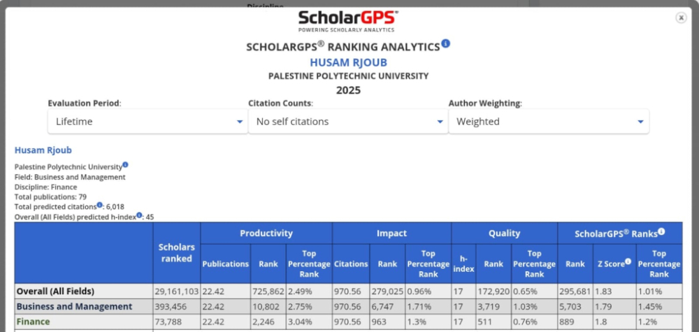 الجمعة 07/11/2025- في إنجازٍ علمي جديد يُضاف إلى مسيرة جامعة بوليتكنك فلسطين المتميزة، أدرج تصنيف ScholarGPS العالمي لعام 2025 الأستاذ الدكتور حسام رجوب عميد كلية العلوم الإدارية ونظم المعلومات وعضو المجلس الأعلى للإبداع والتميّز ضمن قائمة الباحثين رفيعي المستوى (Highly Ranked Scholars) عن السنوات الخمس السابقة، تقديرًا لإسهاماته البحثية المتميزة وإنتاجه العلمي المؤثر على المستويين الإقليمي والعالمي.