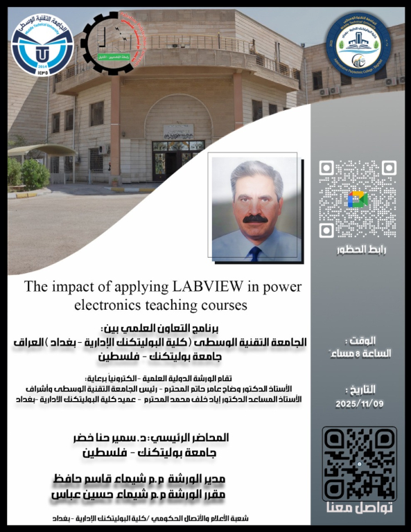 الاثنين ١٠/١١/٢٠٢٥- في إطار التعاون الأكاديمي المشترك بين الجامعة التقنية الوسطى/ كلية البوليتكنك الإدارية – بغداد – العراق وجامعة بوليتكنك فلسطين، عُقدت مساء يوم الأحد الموافق 9 /11/ 2025 ورشة علمية متخصصة عبر تقنية الاتصال المرئي بعنوان: