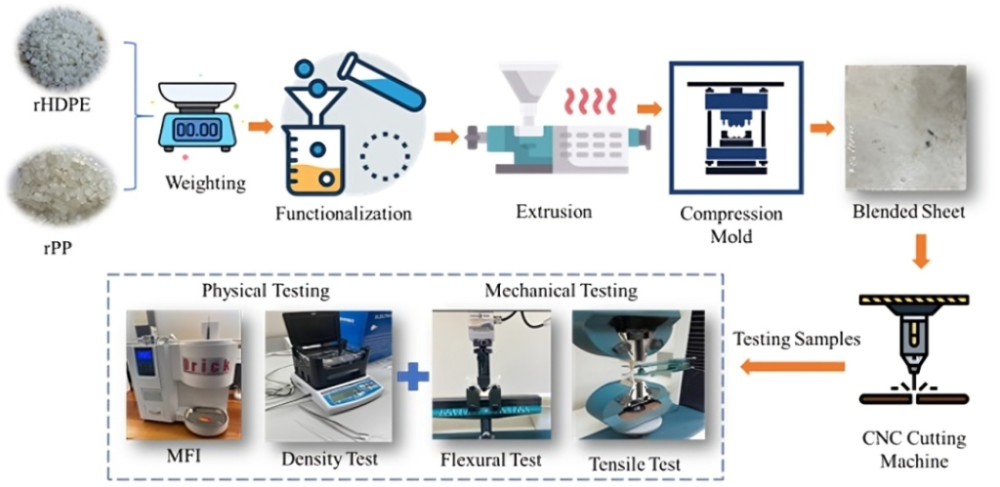 ركزت الدراسة على تطوير خلائط عالية الأداء من البولي بروبيلين والبولي إيثيلين المعاد تدويرها باستخدام المعالجة الكيميائية لتعزيز التوافقية السطحية بين البوليمرات وتحسين الخصائص الميكانيكية باستخدام نموذج احصائي اعتمادا على Design of Experiment والتحليل بالاعتماد على Artificial Neural Network. وأظهرت النتائج أن التركيبة المثالية للخلائط يمكن أن تحقق زيادة تصل إلى 60% في قوة الشد و40% في قوة الانحناء مقارنة بالخليط غير المعالج. بالإضافة لذلك، أظهرت نماذج الشبكات العصبية الاصطناعية (ANN) قدرة عالية على التنبؤ بالخصائص الميكانيكية والفيزيائية للخلائط، مما يعكس دقة المنهجية ويعزز فرص تطبيقها في الصناعات المختلفة.