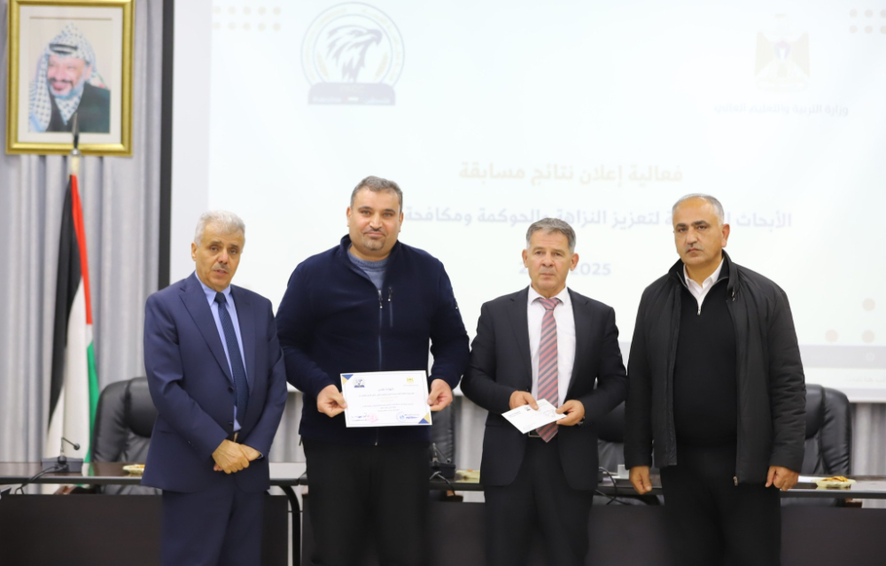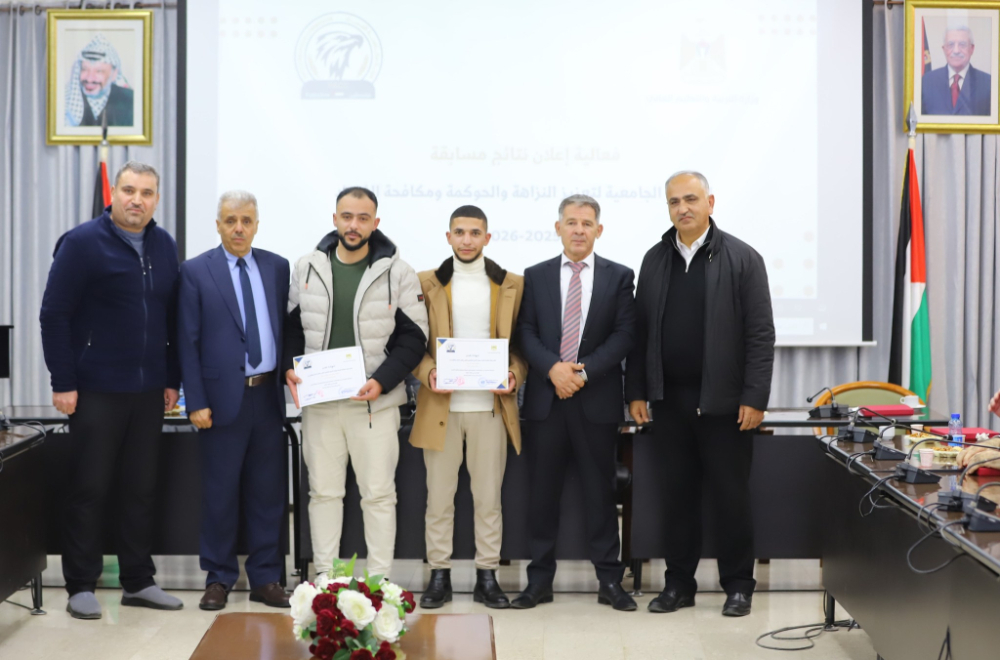 الثلاثاء 13/01/20206- حققت جامعة بوليتكنك فلسطين إنجازاً أكاديمياً وبحثياً جديداً وذلك بانتزاع طلبتها لثلاثة مراكز متقدمة في " مسابقة الأبحاث الجامعية لتعزيز الحوكمة ومكافحة الفساد " والتي أعلنت نتائجها الرسمية وزارة التربية والتعليم العالي وهيئة مكافحة الفساد أمس الإثنين 12/1/2026م خلال حفل رسمي أقيم بحضور وزير التربية والتعليم العالي أ. د. أمجد برهم ورئيس هيئة مكافحة الفساد د. رائد رضوان وحضره عدد من الأكاديميين والإداريين في الوزارتين والطلبة الفائزين وذويهم.