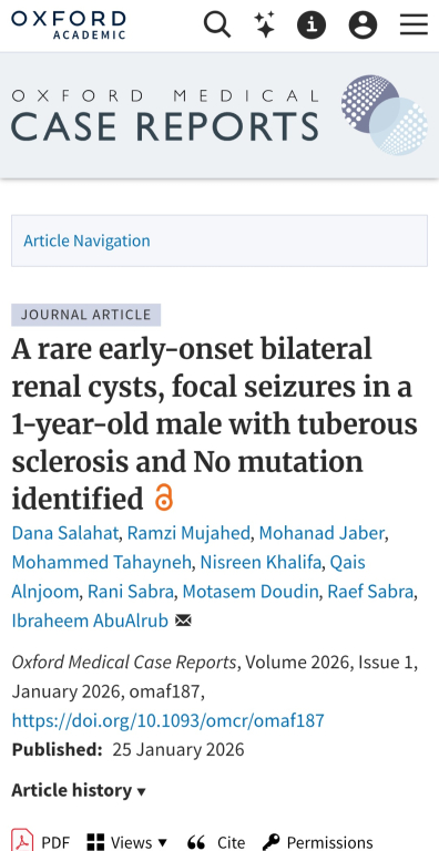 وجاء البحث بعنوان: “A rare early-onset bilateral renal cysts, focal seizures in a 1-year-old male with tuberous sclerosis and no mutation identified”