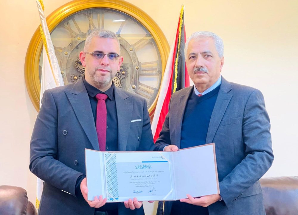 الخميس ٢٩/٠١/٢٠٢٦- كرّمت جامعة بوليتكنك فلسطين، ممثَّلةً برئيسها الدكتور مصطفى أبو الصفّا، رئيس قسم هندسة الأنظمة الرقمية ومدير مركز الابتكار والشراكات الصناعية الدكتور محمود نصّار بحضور مساعد رئيس الجامعة لشؤون خدمة المجتمع الدكتور محمد أبوطه، وعميد كلية الدراسات الثنائية الدكتور موسى ارفاعية، ومديرة العلاقات العامة الاستاذة ناهد صلاحات، والاستاذة سندس تلبيشي، تقديراً لحصوله على المركز الثاني في الجائزة الوطنية للبحث العلمي في سلطنة عُمان ضمن فئة البيئة والموارد الحيوية، وذلك عن بحثه العلمي الموسوم: