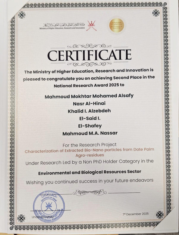ويأتي هذا التكريم اعترافًا بإسهامات الدكتور نصّار العلمية ودوره الريادي في مجال البحث العلمي، حيث تُعد هذه الجائزة الثالثة في مسيرته البحثية، بعد حصوله سابقاً على جائزة أفضل رسالة دكتوراه في الهندسة بجامعة السلطان قابوس، إضافة إلى الجائزة الأولى في جائزة الجامعة العربية الأمريكية للتميّز في البحث العلمي في مجال العلوم الطبيعية والهندسية والتكنولوجية.