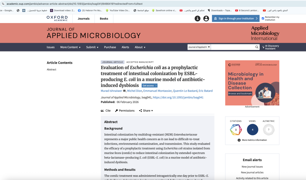 نشر الدكتور مراد اشنيور بحثاً علمياً جديداً بالشراكة مع باحثين فرنسيين من جامعة نانت (University of Nantes) في المجلة العالمية المرموقة Journal of Applied Microbiology، المصنفة ضمن Q1 وذات معامل تأثير 3.8، وذلك بعنوان: